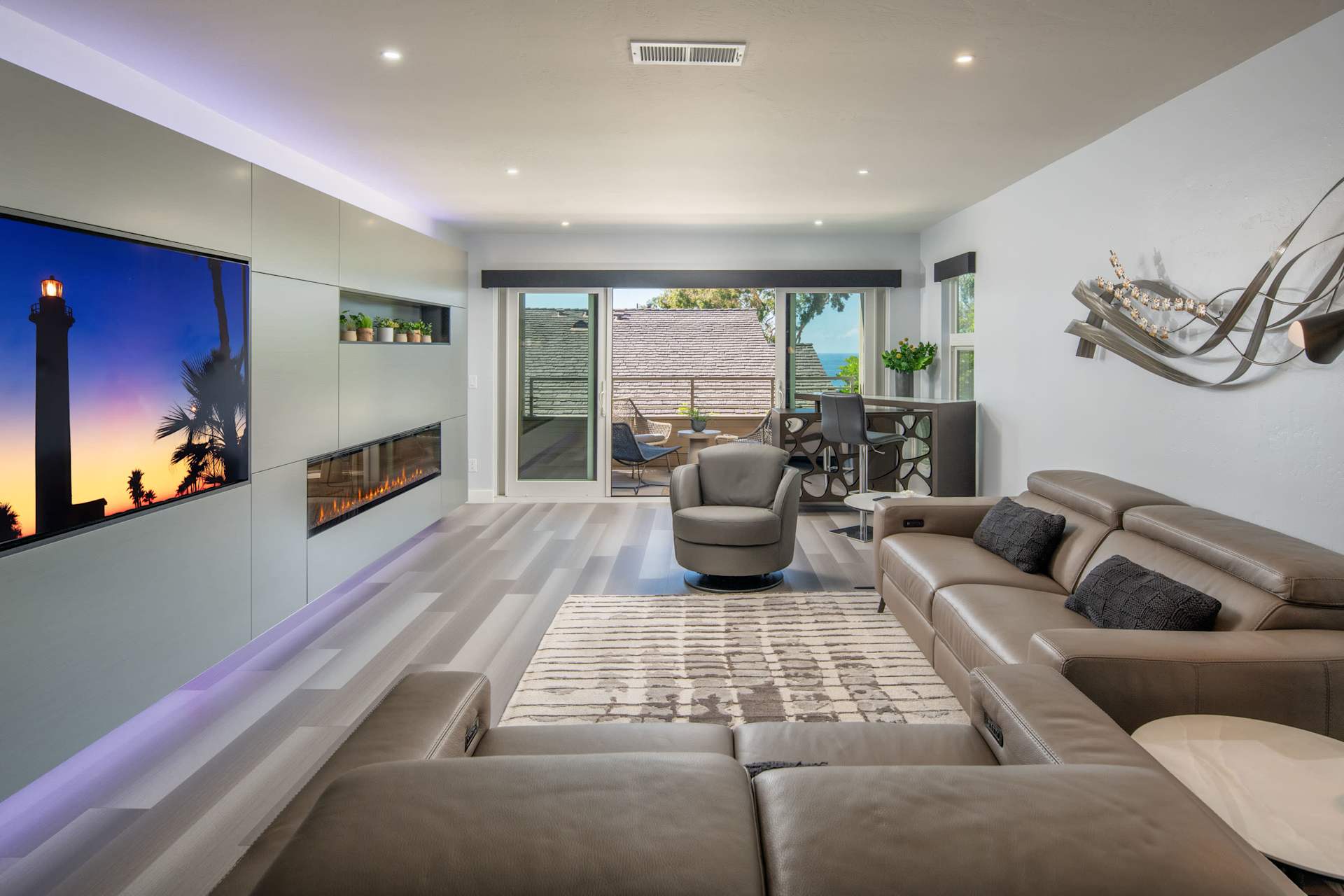 In Del Mar's heart, where waves whisper to this Oceanfront community, discover a haven of coastal sophistication. Welcome to 231 Sea Forest Ct: a turn-key masterpiece radiating refined resort living. Step into this 2-bedroom, 2-bath townhome, where every corner exudes grace and luxury. The open floor plan highlights a chic contemporary fireplace and built-in entertainment console. The sweeping spaces are perfect for both intimate moments and grand soirées. Culinary enthusiasts will revel in this kitchen, showcasing sleek stainless steel appliances, modern cabinetry, and a mosaic of designer tiles that hint at the ocean's hues.