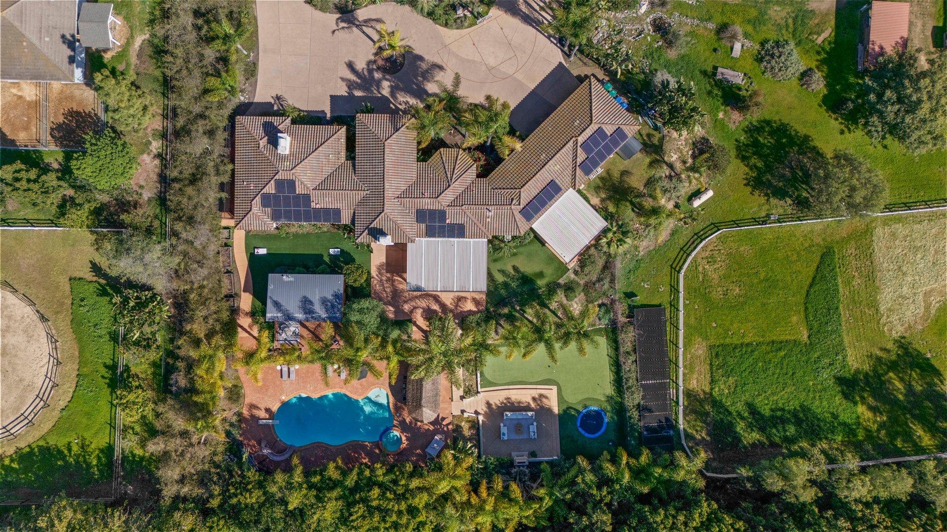 Equestrian amenities include a riding ring and multiple paddocks with individual enclosures, allowing for a true horse property without sacrificing refinement. Beyond the stables, the grounds transition seamlessly into a private retreat designed for gathering and relaxation. A solar-heated pool and spa anchor the backyard, complemented by a putting green, outdoor kitchen with palapa, fireside lounge, and a cedar pool house/casita—ideal for hosting or quiet weekends at home.