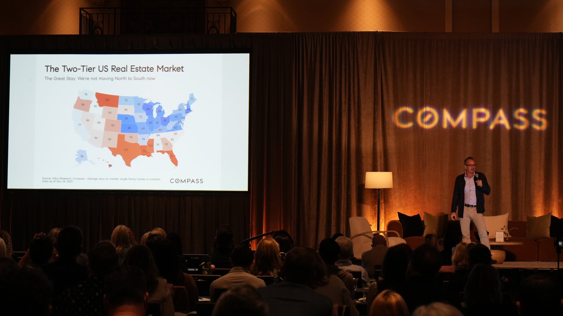 One of the Summit’s most valuable conversations came from Compass Chief Economist Mike Simonsen, who broke down market trends with refreshing clarity. His message was nuanced: transaction volume may rise into 2026, prices may soften, and days on market may stretch. Migration patterns have slowed dramatically—what he referred to as “The Great Stay”—and lending continues to influence market velocity.