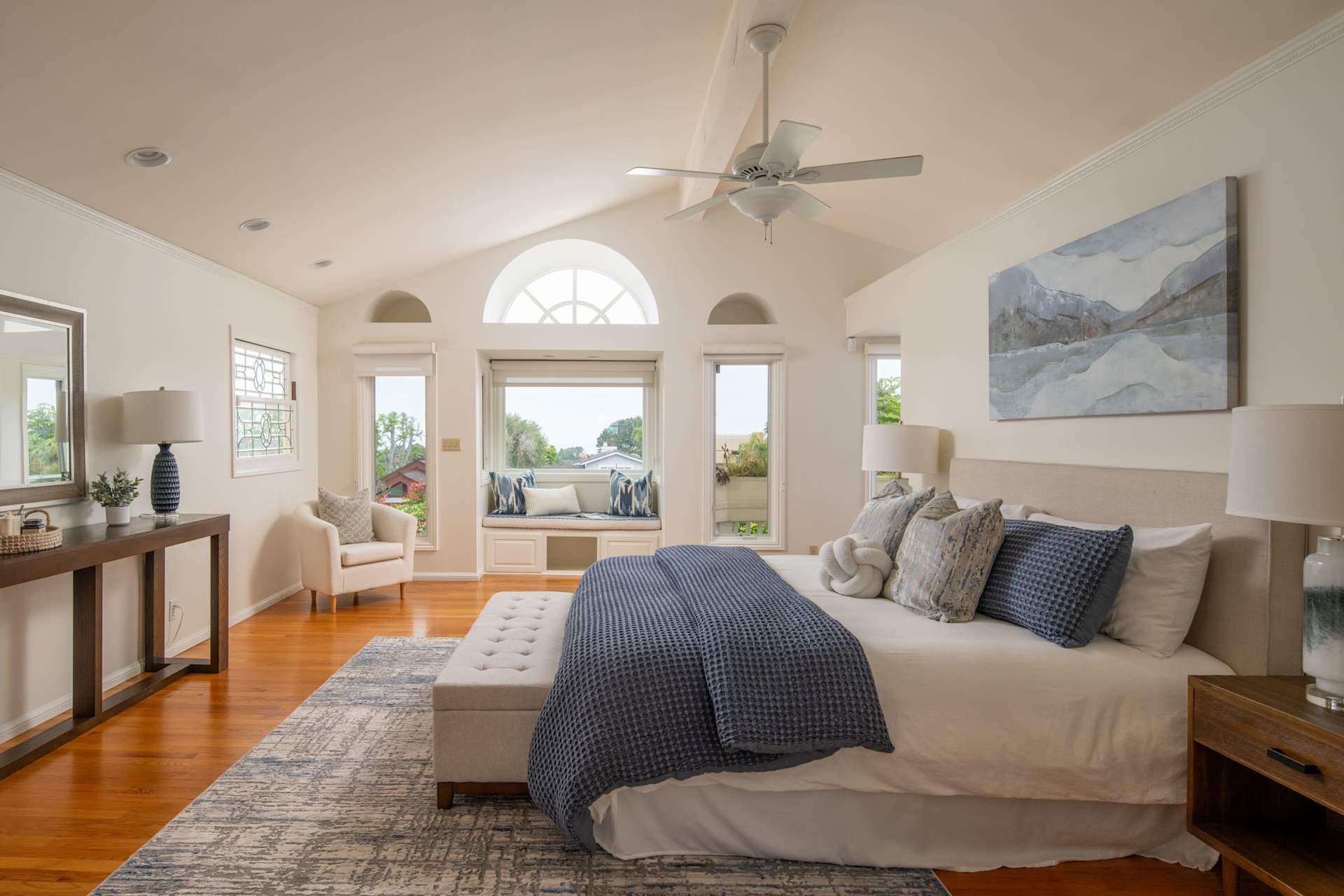 This exceptional 3,187 sq. ft. home features 4 bedrooms and 3 bathrooms. The dining and living areas are bathed in natural light from large bay windows, vaulted ceilings, and skylights. The kitchen features elegant cherry wood cabinets and stainless steel appliances. The lower-level family room, adorned with a fireplace and sliding glass doors, opens to the backyard. The primary bedroom and office offer serene ocean views, creating a tranquil retreat within your own home.